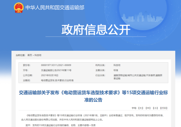 近日,交通运输部发布《电动营运货车选型技术要求》等15项交通运输行业标准(2021年第1批)。其中,《电动营运货车选型技术要求》规定了电动营运货车选型的通用要求、分类要求和分级要求。本标准适用于N1、N2、N3类纯电动营运货车,不适用于燃料电池车辆,该标准将于2021年5月1日起实施。