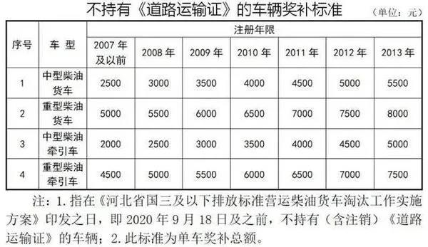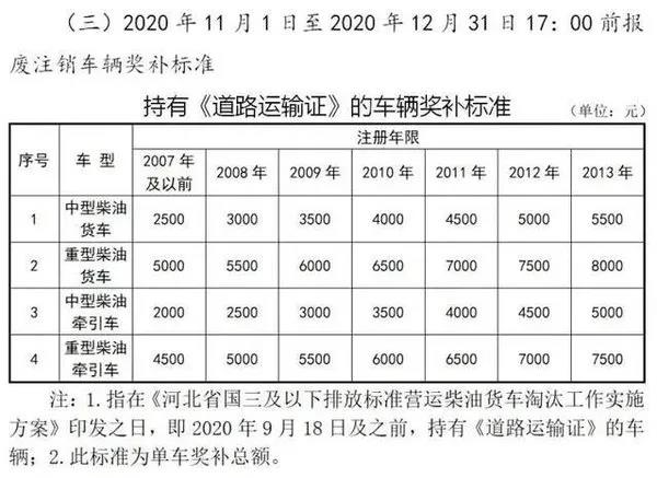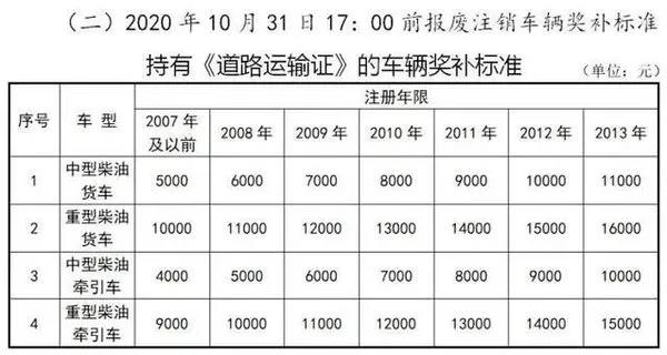 按照奖补标准,2020年10月31日17:00前报废注销车辆,2013年注册的持有《道路运输证》的重型柴油货车,奖励16000元;2020年11月1日至2020年12月31日17:00前报废注销车辆,2013年注册的持有《道路运输证》的重型柴油货车,奖励8000元。